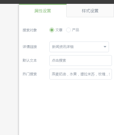 搜索对象:可以设置该搜索插件是搜索文章还是搜索产品,并且搜索结果页面是系统内置的