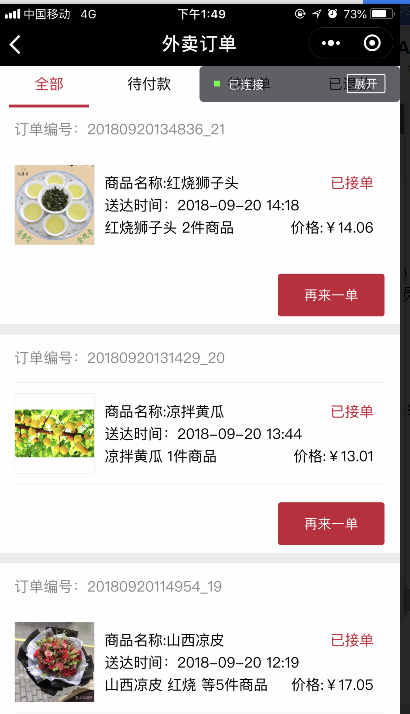 6.选择任意店面,点击进入后,选择相应菜品,点击并购买,若在后台选择的为“自动接单”,则用户付款完成后,后台则会自动接单,打印机也会打出相应的小票,在会员中心中,可以看到相应的订单信息以及配送外卖的信息,在后台,订单接单完成之后,不能进行退款操作如图所示: