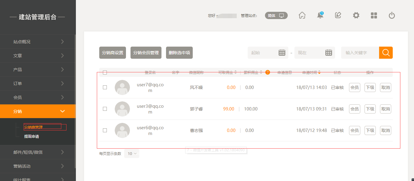 1.点击“后台管理”-“添加商品”选择分销,添加完毕之后每点击保存,点击“分销”-“分销商管理”进行设置,点击保存,在“分销商管理”中可以看到申请分销的用户,如图所示: